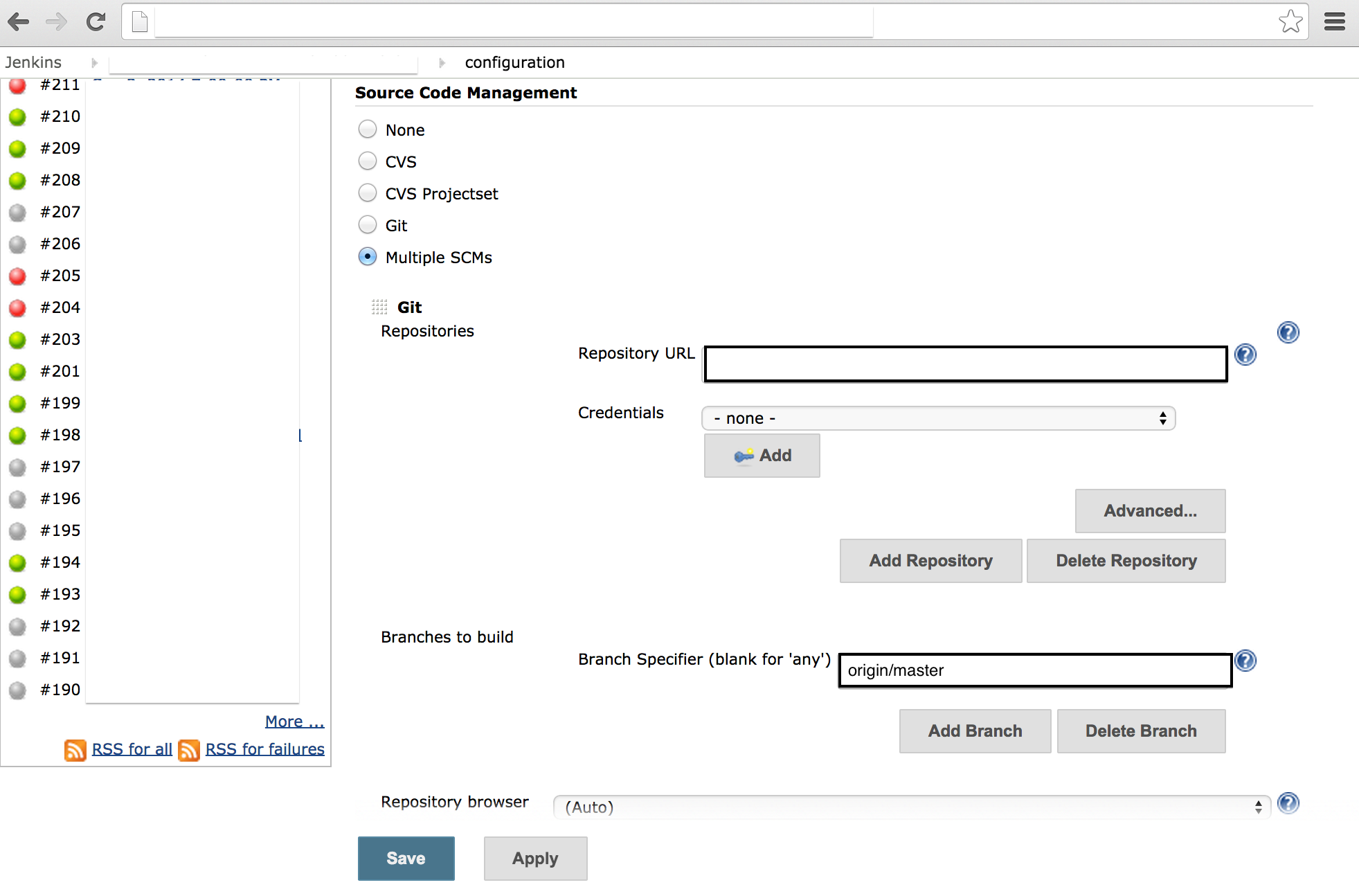Second – Source Code Management, you need to choose if will be one or multiple repositories (Multiple SCMS in this case). After, you write the Repository URL (Example: https://github.com/xxxxx/XXXX.git), put your credentials (if you need some to clone the repository) and click to Add, If you are using multiple repositories you can add more on Add Repository button.