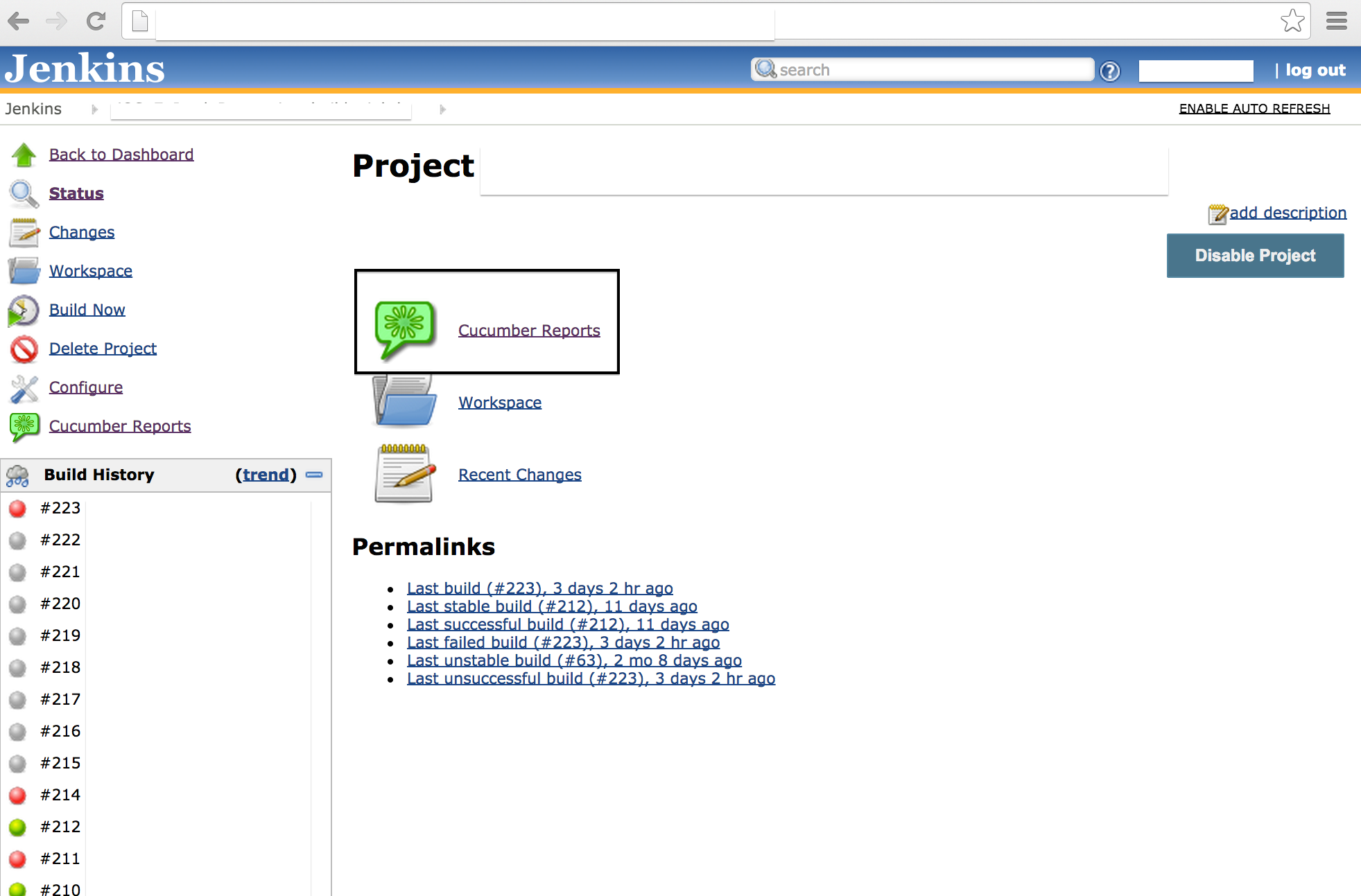 Eighth – After run the test, click on last build and on link Cucumber Reports.