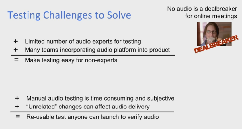 Many challenges we need to face with audio tests: We have limited number of audio test experts, manual audio tests are cost, some scenarios are hard to manual simulate.