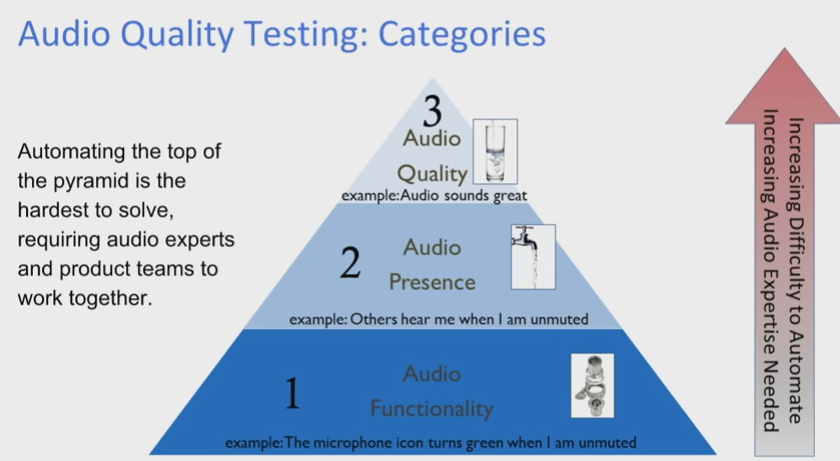 The Audio Test Pyramid shows what you need to start testing. Following this, first test if you are able to receive the audio (Pipes are connected), then check if you are receiving the audio (Water is flowing through the pipes) and the last step is test the quality of the sound (If you can drink this water).