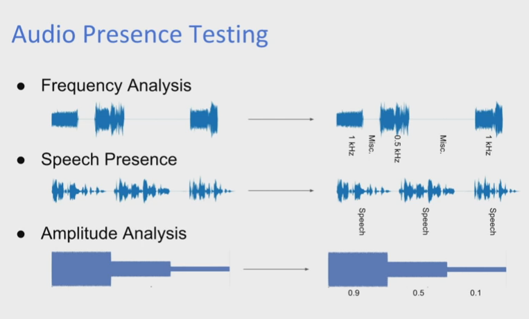 Type of the audio tests you can perform: Frequency Analysis, Speech Presence and Amplitude Analysis with different types of voices, will give you more confidence that the audio works with various voices (kid, adult, women, men, etc).