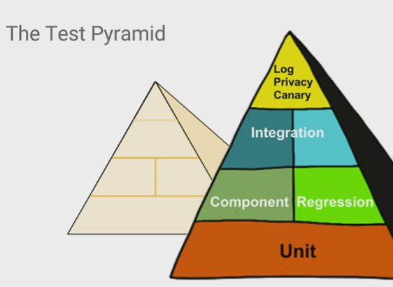 The top of the pyramid is about test the logs, this is not really a common test, but it is about making sure the behaviour is correct, testing the logs according to the action, the base of your system. For example, Google saves all the data from the users in the logs and keep all these information making sure the data is protected. From bottom to top each stage of test requires high level of domain knowledge, high amount of setup costs, investment, time, machine resources.