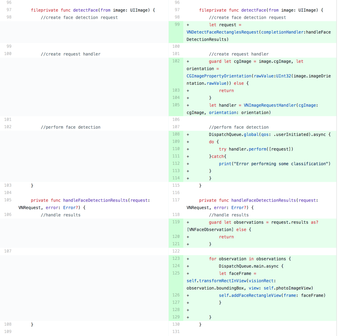In the ViewController.swift you will need to create the face detection request, the request handler and the face detection action. So you will have something like this: