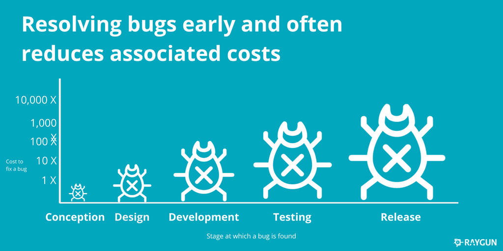 To illustrate: if a bug is found in the requirements-gathering phase, the cost could be $100. If the product owner doesn’t find that bug until the QA testing phase, then the cost could be $1500. If it’s not found until production, the cost could be $10,000. And if the bug is never found, it could be secretly costing the company money. A 2003 study commissioned by the Department of Commerce’s National Institute of Standards and Technology found that software bugs cost the US economy $59.5 billion annually.